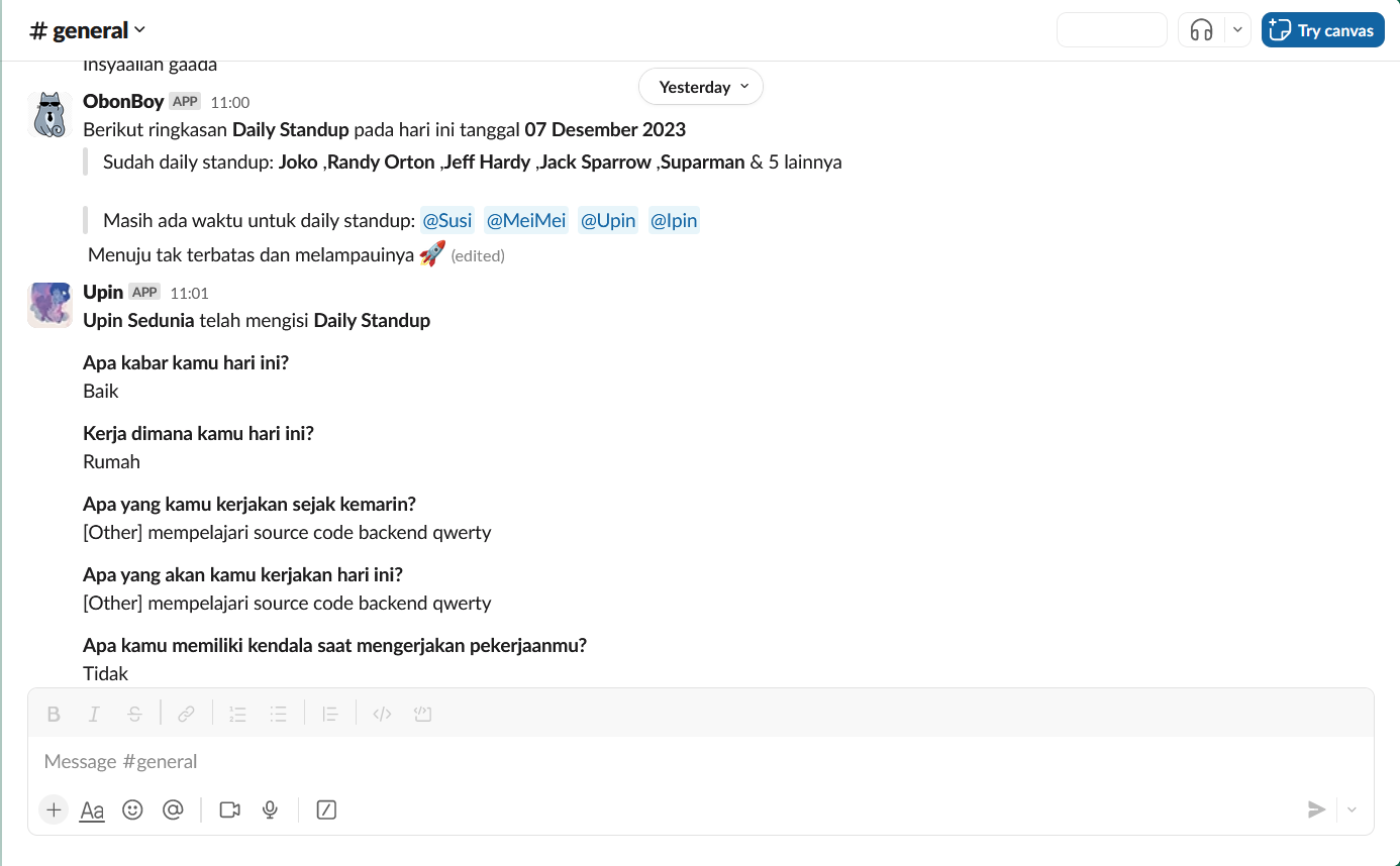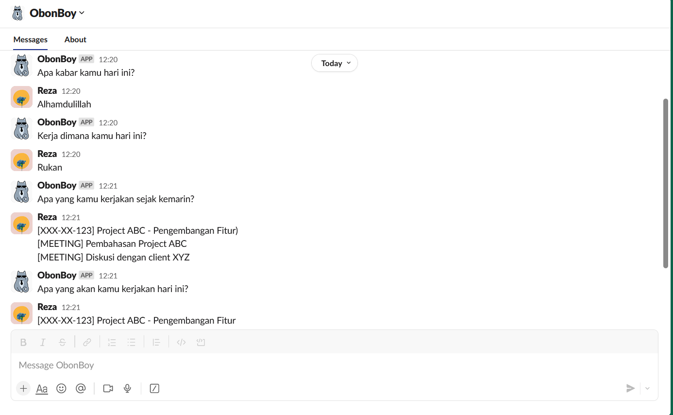ObonBoy is a Slack bot designed for daily stand-ups and weekly work reporting. ObonBoy initiates individual chats with each employee to facilitate daily stand-ups, providing reminders. Once employees submit their updates, a summary of all daily stand-ups is visible in a designated channel. Additionally, every week, ObonBoy engages each employee to collect their weekly work reports, neatly formatted in the sequence and structure specified by the Engineering Group Head, built with C# (.Net Core).